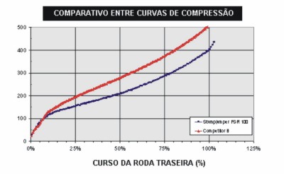 pelo curso da suspensão, curva de compressão da mola, rigidez do