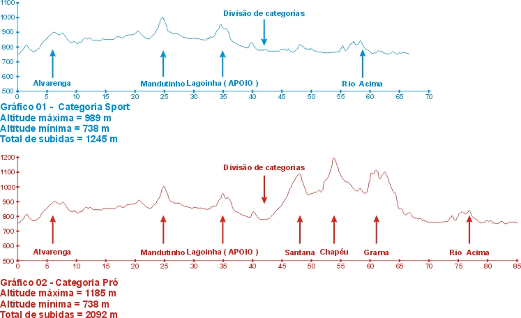 na cidade de Lagoinha, local onde será o apoio de todas as categorias. A partir do Km 43, a competição sobe em 5 Km o Morro da Faz. Santana já no município de Cunha, servindo de aperitivo para as próximas subidas. Deste ponto em diante começa a definição dos líderes desta etapa. Em seguida, outra dura subida ( Morro do Chapéu ) já no município de Cunha com 2 Km e 11% de inclinação, chega-se a cota mais alta da prova com 1185m de altitude. A partir deste local, o cansaço já começa a chegar mais forte, sendo preciso uma boa estratégia de alimentação e reposição de líquidos para enfrentar o quarto final de competição e o mais difícil desta etapa. Após o Morro do Chapéu, em terreno bem acidentado com muitas erosões e cascalho solto, a próxima escalada é pelo Morro da Grama até o Km 63. Sem dúvida nenhuma, uma das mais difíceis desta etapa com pontos de até 14 % de inclinação. Uma verdadeira parede !. Neste cume, num raio de 360º avista-se toda a cadeia de montanhas das Serras do Mar, Quebra Cangalha e Bocaina. Do Km 70 em diante, a prova retorna para São Luis do Paraitinga acompanhando em grande parte as margens do rio Paraitinga com subidas e descidas moderadas. A categoria Sport "cortará" 18 quilômetros deste percurso a partir do Km 42, encontrando-se novamente com a pró na altura do quilômetro 67,5. |